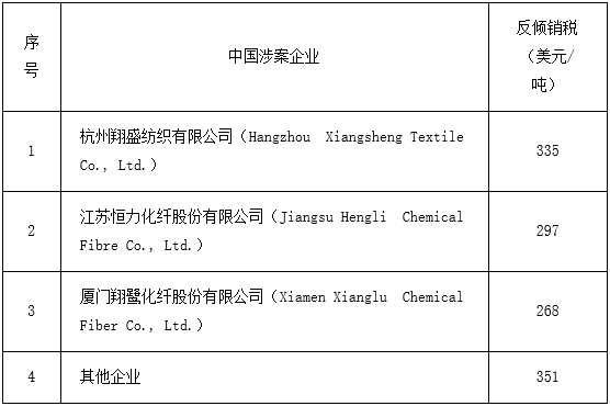2021年2月3日,土耳其贸易部发布第2021/6号公告,对原产于中国、印度尼西亚、马来西亚、泰国、越南聚酯纱线作出反倾销日落复审肯定性终裁,维持上述国家涉案产品的反倾销税,中国为268-351美元/吨(详见下表)、印度尼西亚为48-240美元/吨、马来西亚为276美元/吨、泰国为到岸价(CIF)6.88-37.69%、越南为到岸价34.81-72.56%。涉案产品的土耳其税号为5402.33。公告自发布之日起生效,有效期为5年。
