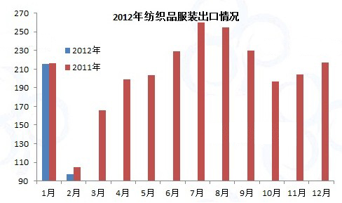 2012年1-2月,纺织品服装累计出口312.30亿美元,同比减2.59%。
