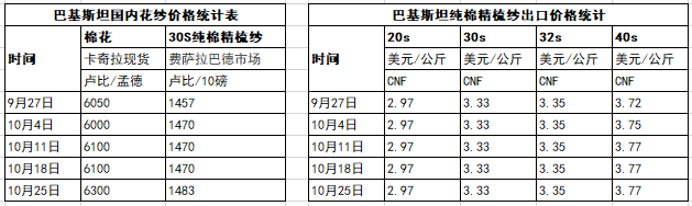 10月19-25日一周,巴基斯坦棉价强劲反弹,棉纱价格随之大幅上涨。目前巴基斯坦国内棉花消费正在复苏,加上预计未来巴基斯坦卢比将会贬值,棉纱出口或受此提振。据统计,上周巴基斯坦棉花价格指数上涨至6300卢比/孟德,JC60S价格飙升52卢比/包,上涨幅度2.11%。