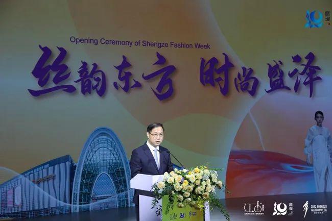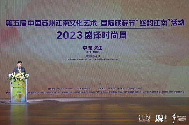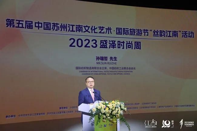 吴江区委书记李铭致辞,国际纺织制造商联合会主席、中国纺织工业联合会会长孙瑞哲讲话,吴江区委常委、吴江高新区党工委书记、盛泽镇党委书记、中国东方丝绸市场党工委书记沈春荣作了以“丝韵东方时尚盛泽”为主题的主旨推介。