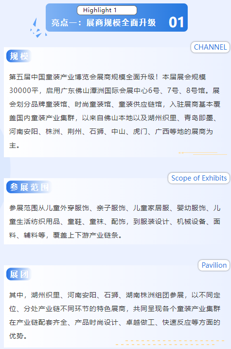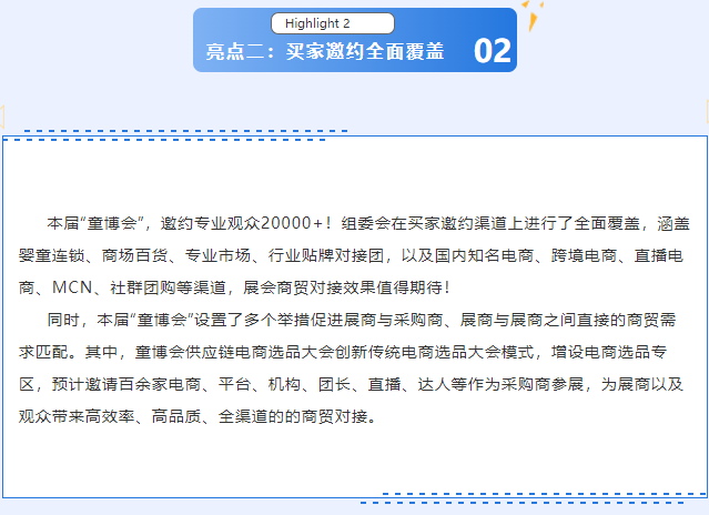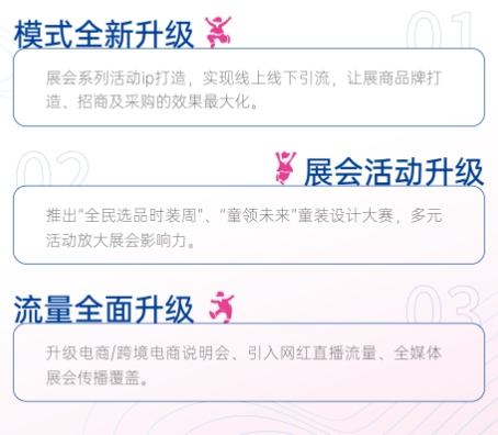 本届“童博会”总结历届成功经验,结合市场新趋势动向,携三大亮点全新升级来袭,充分发挥行业权威展会平台职能与优势,立足全新潮代,协同产业上下共议“童”领未来新格局。