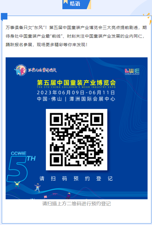 蓄势勃发、万众期盼!第五届中国童装产业博览会(缩写:CCWIE,以下简称“童博会”)将于6月9-11日在广东佛山潭洲国际会展中心举办!距离启幕不足半月之际,从展商对接、活动策划,到专业观众邀约,2023“童博会”经过有条不紊的前期准备,已然整装待发,信心满满等待业界全方位考察与检验。