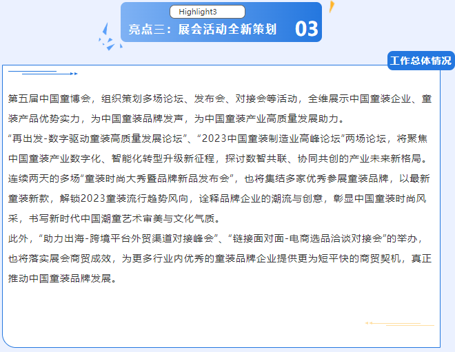 中国童装产业博览会(缩写:CCWIE,简称“童博会”)是国内早专注于童装产业的全产业链博览会,自2019年首次举办以来,目前展会规模已达5万平米,单届参展企业超过800家、品牌1500余个,专业观众人数超过25000人次。