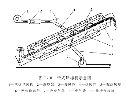管道型、喷泉型烘棉机虽然比多层塔式烘棉机效率有很大提高,节能效果也很明显,但它们的烘棉原理和多层塔的形式基本上一样,即用热风输棉烘棉。作业时只能操纵风和气风量,不能操纵烘棉时间,子棉接触热风时间只有5~6s。带式烘棉机能操纵烘棉机的烘棉时间,提高烘棉效果。它是当今新技术的烘棉机。