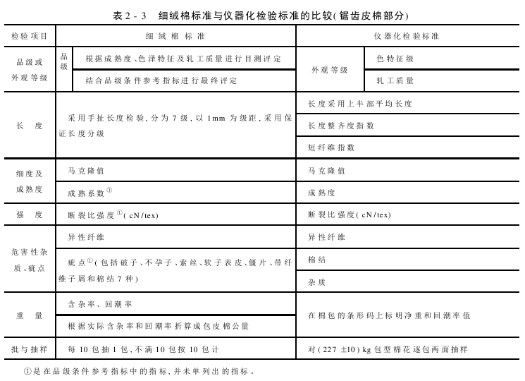 (1)从表2-3中的信息不难看出:这两个标准均是从品级或外观等级、长度、细度及成熟度、强度、危害性杂质、疵点及重量方面进行检验的,而这几方面都和纺纱质量紧密相关。仪器化检验标准更贴近棉花纺织厂进一步整理的要求。对单纯的外在色泽特征使用仪器测出反射率和黄度,周密的仪器测试提高了长度、强度方面的精确度。将轧工质量单独作为外观等级的一项评定指标,可引起轧花厂对技术设备的重视,以提高整理质量。