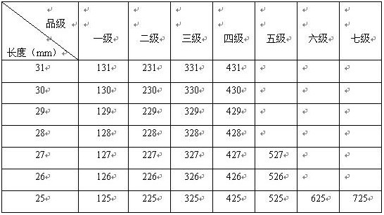 2、长度分级。长度分级用手扯尺量法进行,手扯纤维得到棉花的主体长度(一束纤维中含量多的一组纤维的长度),用专用标尺测量棉束,得出棉花纤维的长度。各长度值均为保证长度,也就是说,25毫米表示棉花纤维长度为25.0-25.9毫米,26毫米表示棉花纤维长度为26.0-26.9毫米,以此类推。同时国标还规定,28毫米为长度标准级;五级棉花长度大于27毫米,按27毫米计;六、七级棉花长度均按25毫米计。