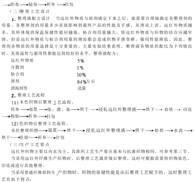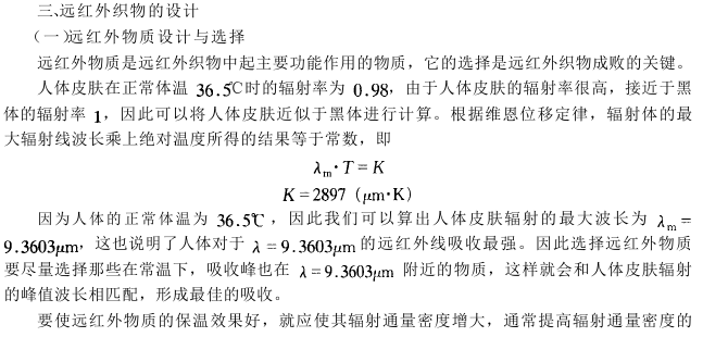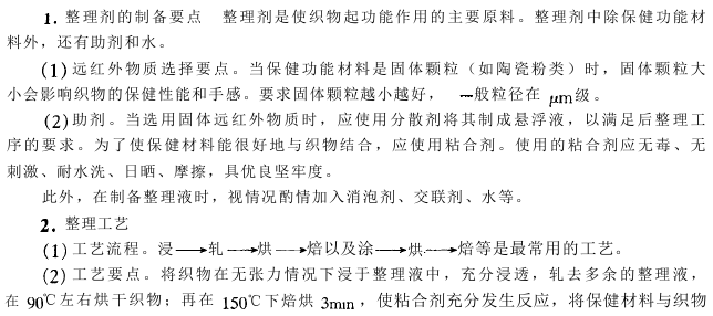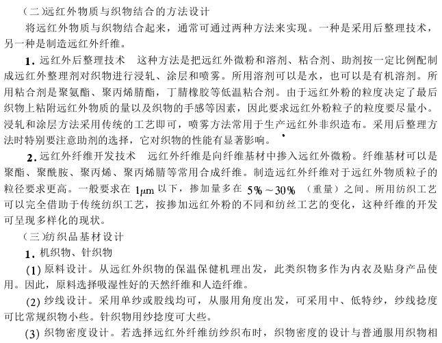 2.向功能新型化进展 传统的远红外面料品通常是以织物或纺丝原液为基材,加入远红外辐射物质。如今正在向突破这一格局的方向进展,在远红外的基础上再进展新的技术生长点。例如可以在产品中掺入一些稀有放射性元素矿石微粉,产生负离子效应。这种新型的远红外织物将是远红外布料品进展的一个方向。
