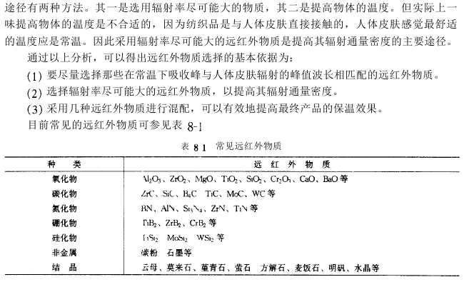 1.向功能高效化进展 开发远红外织物的关键所在就是如何使得终产品具有高效的远红外线辐射性。一种趋势是寻 寻新的高效远红外辐射物质,另一种趋势是通过不同远红外物质的匹配来获得高效的远红外辐射率。通过将两种以上的远红外粉混合在一起,或者经高温烧结后再破碎成微粉,用于纺丝或后后整理,可不同程度地克服单一陶瓷粉的缺点,提高其远红外辐射率。