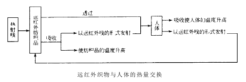远红外物质通过汲取太阳完中的远红外线,将其转化为自身的热能储存起来。根据基尔霍夫定律和斯蒂芬一玻尔兹曼定律,好的汲取体也是好的辐射体,温度高于绝对零度的物体都能不断辐射能量。因此远红外物质除了强烈地汲取太阳完中的远红外线之外,也不断地积极向外辐射远红外线。人体也是远红外线的敏感物质,对远红外线具有强烈的汲取作用。当人体皮肤遇到远红外物质辐射出的远红外线时,会发生和振动学中共振休闲相似的情况,汲取远红外线并使休闲进一步激化。转化为自身的热能,皮肤表面的温度就相应升高。这样,远红外织物就通过远红外物质达到了积极的保温作用。从下图可以直观地看出远红外织物的保温机理。