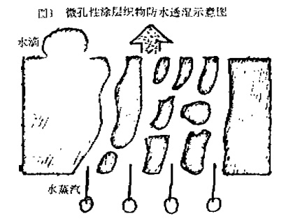 原透j_j】l的织物经过防水沫后,表耐彤成—连续的薄膜,封j现了纱缱之川韵t隙,陵遘湿性降低,甚至不迭泓。要使织物保|竽透性,就要把涂层的连续薄膜变成不莲的无数馓孔的网状结构薄膜这种微孔能‘鹑H物纱线之间的空隙形成一个通道;线物应存在蕾一定的水蒸汽分差,空气便州j通道删问另一侧扩散;微孔结构的直往银小,只有0.5—20u,水滴的直径大,在l00一.;0a之阅,因此雨滴不能透过。水蒸汽f汗液)的径仅有0.0004;~,所以能够大量逸Hj,起到防水透湿的效应。