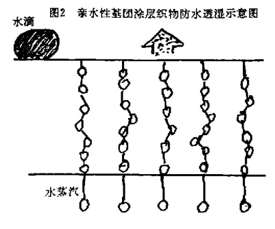 此法先制成一个微孔性的薄膜,然后与织物复合。聚四氟乙烯微孔薄膜是用特殊加工方法制得的。先台成高结晶的颗粒,而后在390—400℃的高温条件下,纵横双向同时给于均匀一致的拉力,迅速拉伸成薄膜。厚度为20—25m,微孔直径大为0.2u,孔径密度达13.95亿个/厘米。聚氨酯微孔结构薄膜也用上述相似原理制造,其微孔直径为0_u,孔径密度约1.55亿个/厘米t。本方法适合于复合涂层的薄膜复贴在纺织品。其透湿性取决于薄膜的质量具有高透湿、高防水性能t但制造薄膜的技术难度相当高,成本昂贵。4高亲水基团的化学透湿法这是一种非微孔性的薄膜材料。这种透湿水滴圈2亲水性基团涂层织物防水透湿示意图涂层的关键特征是在聚氨酯大分子结构中含有足够量的高亲水基,作为水蒸汽移动的阶梯。水蒸汽通过吸收、扩散、解吸等物理作用透过薄膜。