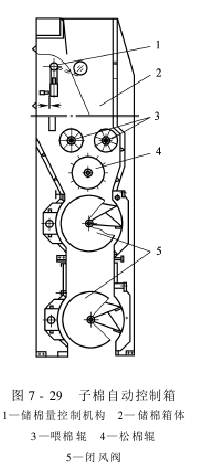 子棉自动操纵箱起储存子棉、调节工艺中子棉流量的作用,其结构如图7-29所示,它主要由储棉箱体、1对喂棉辊、松棉辊、2个闭风阀组成。其主要工艺性能有以下几方面。
