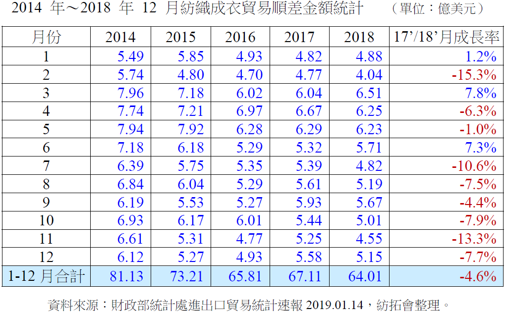 出口:2018年12月台湾纺织成衣出口金额8.32亿美元,较2017年12月8.61亿美元衰退3.4%;2018年1-12月台湾纺织成衣出口金额100.80亿美元,较前一年同期100.78亿美元微幅成长0.02%。