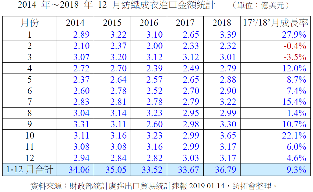 进口:2018年12月台湾纺织成衣进口金额3.17亿美元,较2017年12月3.03亿美元成长4.6%;2018年1-12月台湾纺织成衣进口金额36.79亿美元,较前一年同期33.67亿美元成长9.3%。