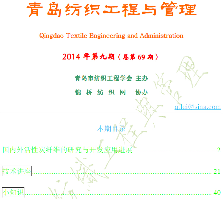 由青岛市布料工程学会主办、布料网协办的《青岛布料工程和治理》电子期刊于2009年1月正式创刊。该刊由青岛市面料工程学会秦志强工程师任主编。该刊除以电子邮件形式发送至会员单位外,还在面料网开设特意窗口供业内人士进行扫瞄和查阅。该刊的创办定能为广大面料业技术人员提供1个技术交流平台,为我国面料业技术创新起到积极作用。