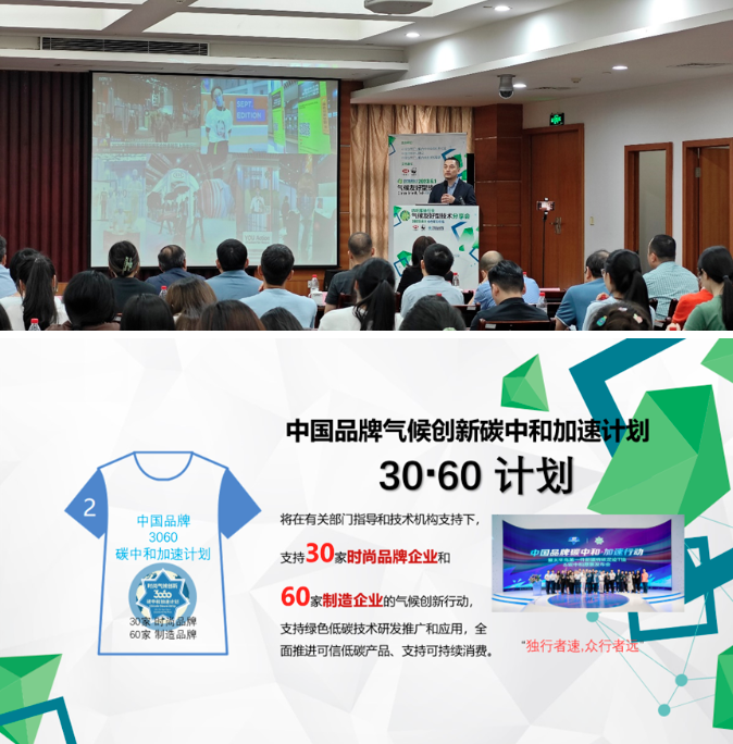 中国纺织工业联合会社会责任办公室副主任胡柯华先生,在会议上针对GreenHUB纺织行业绿色低碳循环转型项目进行了介绍。本项目是由中国纺织工业联合会社会责任办公室在中国纺织信息中心、HSBC汇丰银行、WWF世界自然基金会的支持下,共同开发的GreenHUB绿色技术创新加速平台,为中国品牌气候创新碳中和加速计划(30▪60计划)打造行业基础设施。胡主任在分享中介绍了气候创新2030行动纺织业的行动目标与路线图,并结合我国“双碳”目标以及中国纺织服装行业碳排放整体情况,对30▪60计划进行了全面介绍。同时胡主任透露,在2023年还将举办5场纺织服装行业气候友好型技术分享会。