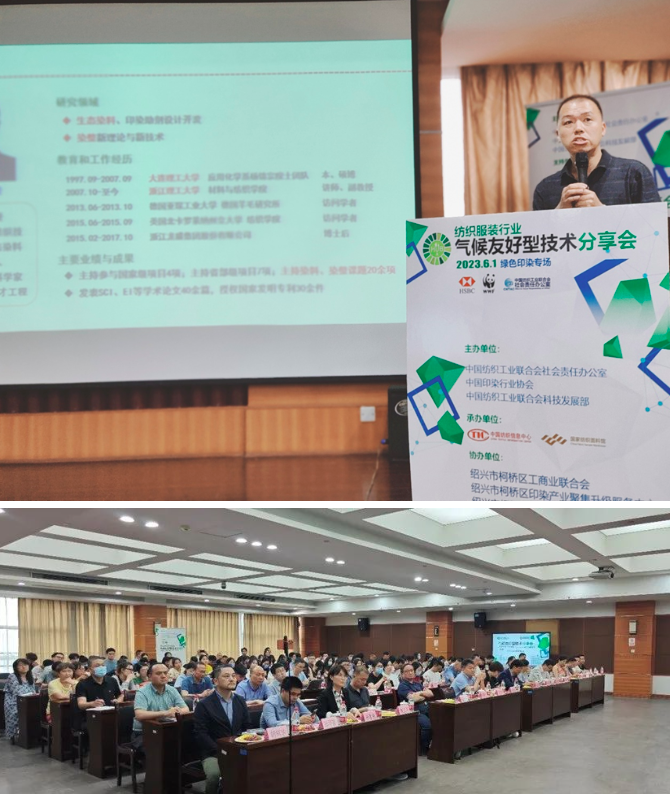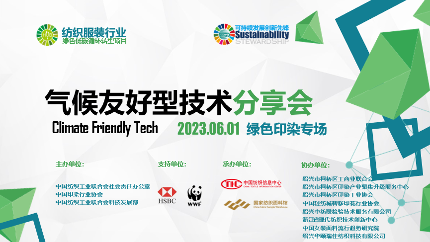 2023年6月1日,纺织服装行业气候友好型技术分享会[绿色印染专场]在绍兴市柯桥区顺利举办。此次技术分享会由中国纺织工业联合会社会责任办公室、中国印染行业协会和中国纺织工业联合会科技发展部主办,中国纺织信息中心和国家纺织面料馆承办。为推动绿色低碳纺织产业发展、促进产业绿色清洁化转型提供科技支撑,HSBC汇丰银行和WWF世界自然基金会为本次活动提供支持。
