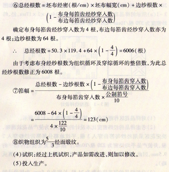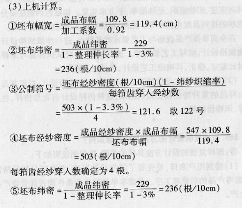 根据有关资料及生产实践获得织物后后整理为不漂白的大后整理,其整理系数可取0.92(整理系数=成品布幅/本色棉布布幅),后整理的伸长率为3%。