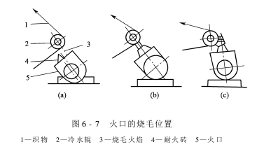 近年来火口向由计算机操纵方向进展,可以通过用火焰强度、布面温度、车速以及火口和织物之间的距离等四项参数编制而成的自动操纵程序,自动操纵火焰强度,利用火口可以转动,能产生不同的烧毛位置,进而可以产生弱烧、中烧、强烧三种效果。如图6-7所示。