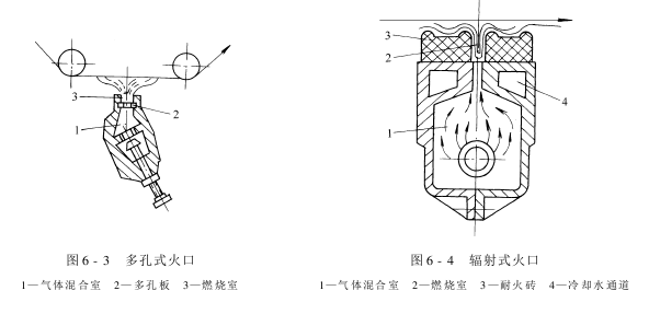 ②辐射和火焰混合式火口:图6-4所示为辐射式火口。它是在铸铁制成的火口上加装异形耐火砖。当火焰由火口喷射到织物表面进行烧毛时,织物对火焰及被它带动的热空气有肯定的反射作用,使火焰和热空气反射到异形耐火砖上继续燃烧,并使耐火材料产生热辐射。这样,提高了烧毛温度和火焰的均匀性,增大了布面和火焰的接触面,从而提高了热效率,加快了车速。