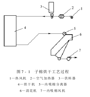 子棉烘干系统由空气加热系统(或供热装置)、烘干机及烘干输送系统组成。空气加热系统的设备组成因热源的不同而不同。用燃料油或天然气作加热空气的热源时,供热装置是燃油加热器和燃气加热器,也称燃烧器。用电、煤作加热空气的热源时,供热装置是电加热器、热风炉。用蒸汽或有机热载体作加热空气的热源时,空气加热系统由工业锅炉或加热炉(供热装置)、换热器(换热装置)组成。烘干输送系统主要由供料器、输棉管、内吸棉分别器、回风管、通风机(包含送热风机)、除尘器等机件组成。