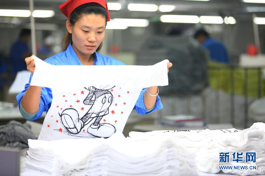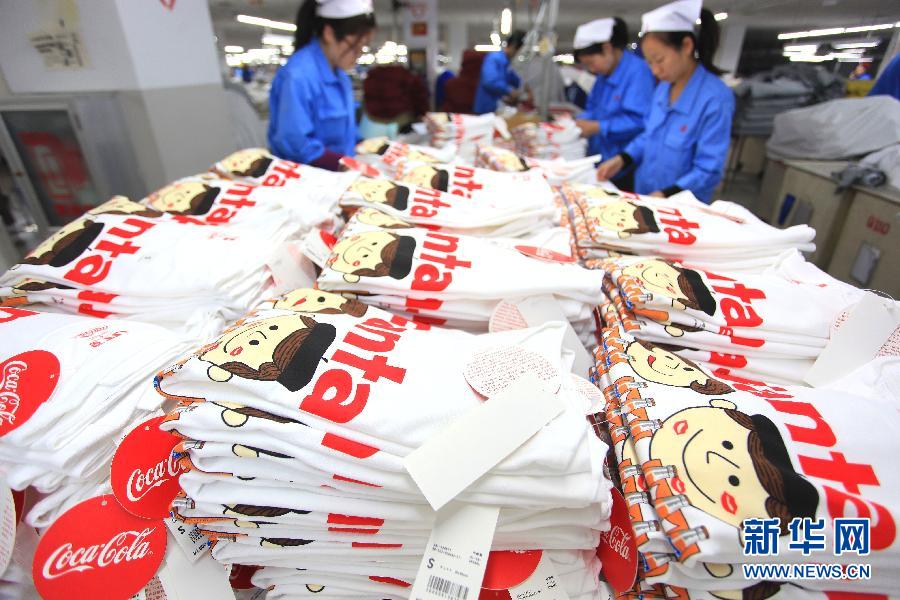 12月5日,山东省即墨市即发集团的工人在包装出口到海外市场的服装产品。