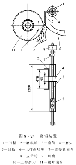 上排杂刀口往往粘有虫屎、虫尸,它们会粘挂纤维、不孕子,当它们积聚到肯定程度时,就形成许多个棉条挂在刀口,在锯片之间悬浮。它们既可能被锯齿抓住重新混入皮棉,影响皮棉质量,又会在气流刷棉时,干扰冲风口的气流流向,造成气流流态紊乱、刷棉不良、落棉损失增加。为此,应及时刷落上排杂刀口粘附的杂物,保持上排杂刀口清洁。现在一般采纳磨辊或刮杂辊装置对上排杂刀口进行清洁工作。图8-24所示是磨辊装置,磨辊轴上有两个旋向相反的螺旋槽,磨头利用叉角嵌在螺旋槽内,磨头上装有两块刮板。当磨头随磨辊轴的旋转在轴上做往复休闲时,刮板可以刮落粘附在上排杂刀口的杂质。刮板的工作全程应满足上排杂刀口的长度。为预防杂质嵌入螺旋槽中,磨头的两侧应套上布套。刮杂辊依靠刮杂辊的旋转,由弹性叶板擦打粘附在上排杂刀口的杂质。
