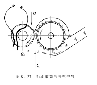 ③向毛刷滚筒低压区补充空气的风量Q1 、Q2 、Q3 的操纵和调节:毛刷刷棉时,在毛刷滚筒表面形成高速气流层,使毛刷滚筒附近成为低压区。这样,四周的空气不断地流向毛刷滚筒低压区,接着又被高速气流层卷吸带走。这种不断的补充和卷吸是刷棉点和下排杂区域气流场的特点。向毛刷滚筒低压区补充的空气来自三方面,如图8-27所示。