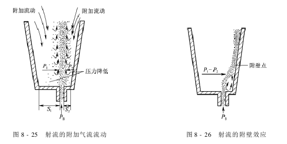 如果射流射入一个和大气相通的容器,且射流和容器侧壁的距离不等。由于射流的卷吸作用,射流四周的空气被卷吸带走,造成射流四周的空气压力下降。此时,外界空气就向射流四周补充气流,形成附加气流流动,如图8-25所示。