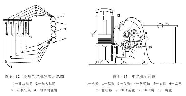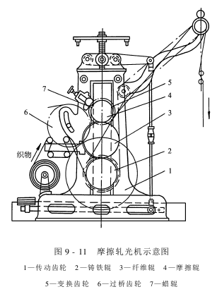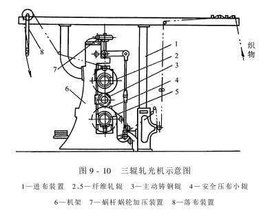 一般轧完机适用于织物的一般轧完后整理,用于各类漂、色、花平纹织物的平轧完,在加重压力的条件下,也可作为硬浆薄织物的重轧完后整理用设备。图9-10为一般三辊轧完机示意图。