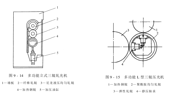 (1)多功能站式三辊轧完机:如图9-14所示。该机采纳油缸下加压方式加压,上面的纤维辊可依需要进行更换,下面为加热钢辊,可采纳蒸汽、燃气及电加热,热辊表面高温度可达250℃。采纳不同的穿布方式可获得不同的轧完效果。如织物经纤维轧辊和尼龙液压均匀轧辊间的轧点可获软轧完效果,织物经加热钢辊和尼龙辊轧点可获平轧完效果。