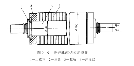 它们都由机架、轧辊、加压装置、传动装置、加热系统和进出布装置等组成,其中轧辊分为软轧辊和硬轧辊两类。软轧辊一般由棉、麻、毛等纤维纸、聚酰胺或织物压制而成,叫纤维轧辊,结构如图9-9所示。其特点是弹性好、耐热、耐用、能承受较大的压力。硬轧辊为金属轧辊,是主动辊,主要是用铸铁、淬铁、钢等金属制成,其中淬铁辊表面硬度高,易保持平坦完滑度,常作轧完辊使用。加热辊均为金属辊,有电加热、蒸汽加热及热油加热等形式。加压方式多为重锤杠杆加压和油压加压。