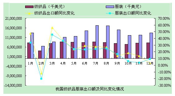 2011年12月,我国出口纺织纱线及织物83.01亿美元,出口服装及衣着附件134.42亿美元,分别比11月增长了3.32%、9.28%,纺织品及服装出口增幅均降至个位数。1~11月,中纺织品出口946.6亿美元,增长22.9%,服装出口1532.2亿美元,增长18.3%。