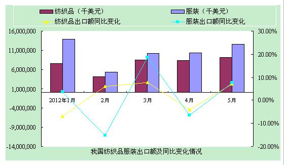 5月,纺织品服装出口实现增长,但增幅不及全国货物贸易。当月出口218.3亿美元,增长7.4%,其中纺织品出口92.3亿美元,增长7.1%,服装出口126.1亿美元,增长7.6%。当月出口环比,尤其是服装环比增长较快。纺织品服装出口环比增长16.1%,其中纺织品增长9.7%,服装增长21.4%。