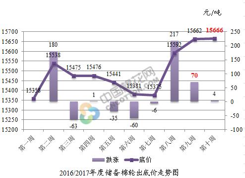 中国棉花网专讯:根据国家发改委、财政部公布的《关于国家储备棉轮换有关安排的公告 》(2016年第9号)对储备棉轮出销售底价计算公式,2016/2017年储备棉轮出第十周(5月8-12日)储备棉轮出标准级销售底价为15666元/吨,较第九周上涨4元/吨;每日上市实际批次储备棉的销售底价,以标准级销售底价为依据,按棉花公证检验结果及中国棉花协会公布的有关质量差价表计算确定。
