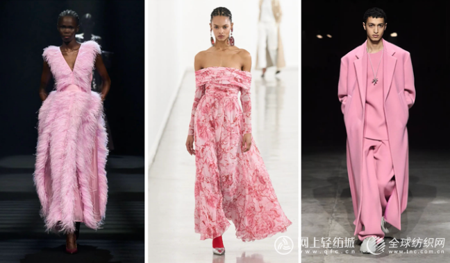 尽管是秋冬季发布,象征着浪漫的春日粉也是本季T台上一道靓丽的风景线,除了基本款的设计外,当粉色与羽毛、花卉、亮片结合都十分契合,打破秋冬季设计的无趣与沉闷,传递出轻盈浪漫的基调。