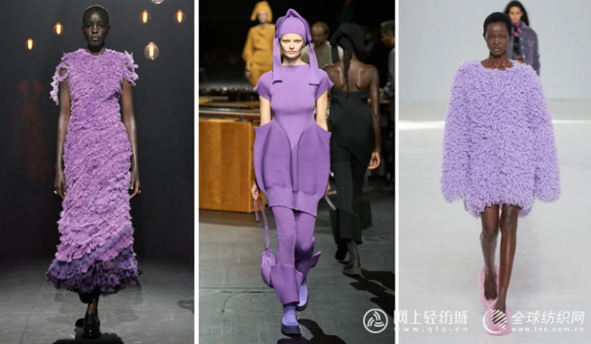 清新又浪漫的香芋紫也是2023秋冬T台上不容忽略的色彩之一,有着紫色调的神秘,又兼顾粉色调的浪漫,清新可人。伴随着色调的浓度变化,其表现效果也略有不同,如Erdem、Issey Miyake、MSGM的深色调,亦或者Max Mara和Paco Rabanne的浅色调,让浪漫有迹可循。
