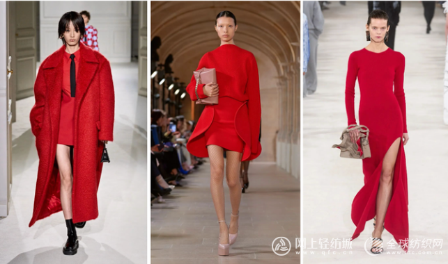 正红色也是近两季流行必备,在2023秋冬各大时尚品牌发布中依旧坚守流行位。Valentino本季放弃了刷屏的玫红色,找回品牌基因中的“Valentino红”,Victoria Beckham、Y/Project、Tory Burch、Jason Wu等大多数品牌本季设计中也都有那样一抹红,强势冷艳。