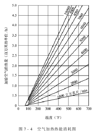 例如,要求每小时加热15300m3 的空气(约9000站方英尺/min),加热后空气的温度为121℃(约250u),查图7-4可知,每小时消耗的热能约为184.5MJ(约1750000英热单位)。
