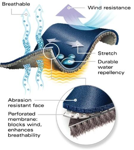 采用超细纤维(细度小于1dtex)紧密织造,使纱线间隙小到不允许水滴通过,有些纱线,遇水膨胀,间隙会变得更小.然而对于直径仅为万分之四微米的水蒸汽分子,通道却是足够宽敞了,从而达到防水透气的目的.
