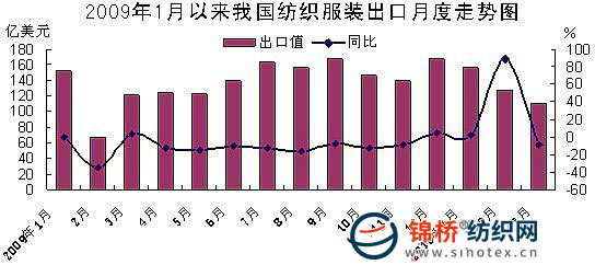 一、2010年以来月度出口额逐月下降。2009年12月我国纺织服装单月出口额回升至167.8亿美元,创2009年以来月度出口高值。2010年以来月度出口额逐月下降,其中3月当月出口110亿美元,同比下降9.5%,环比下降12.9%(下图)。