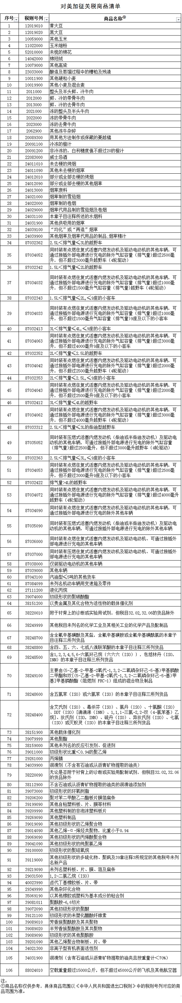 一、加征关税的商品为大豆、汽车、化工品等14类106项商品。征税范围详见附表。