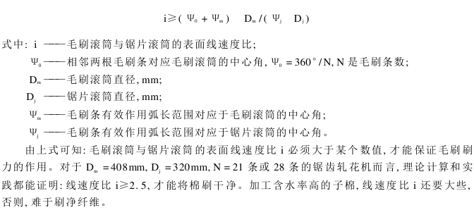 ①毛刷滚筒和锯片滚筒表面线速度比:毛刷刷力主要靠毛刷条对锯齿上纤维的连续作用来保证。依据连续作用要求,可以得出如下关系: