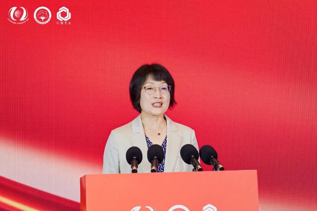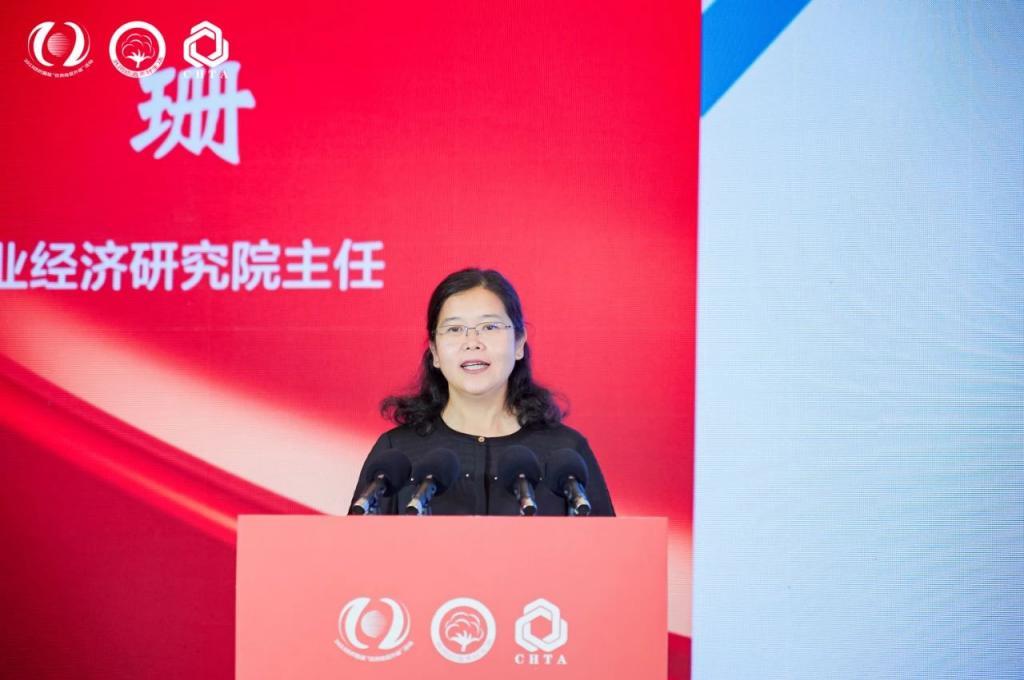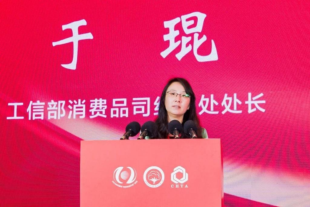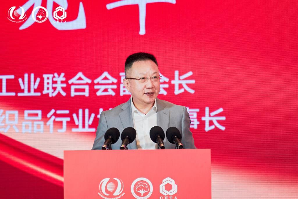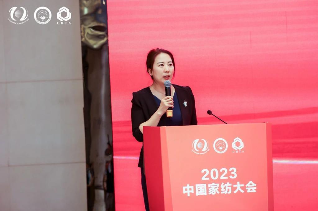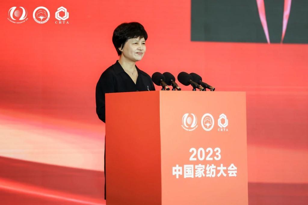 中国家用纺织品行业协会会长朱晓红,主持大会嘉宾致辞环节。