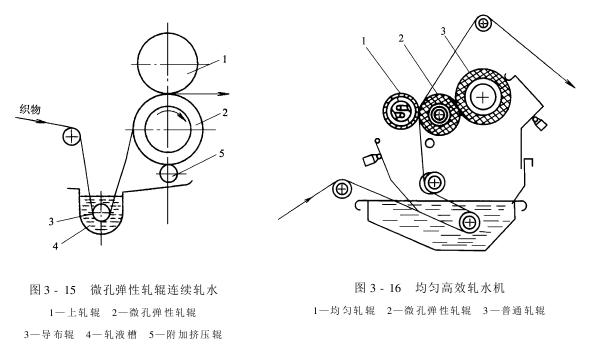 为了使微孔弹性轧辊连续工作,必须将吸入微孔中的水分及时排出,图3-15为其连续轧水的示意图。在微孔弹性轧辊轧点的另一侧,安装一根附加挤压辊,用它即可将轧辊微孔中的水分预先挤压排解。微孔弹性轧辊不仅可提高轧水效率,而且由于轧压力较低,对整理织物和轧辊自身的损伤很小,特别适用于针织物物等不宜承受高压的织物。但是,随着使用时间的增加,轧辊的弹性将会逐渐减低,影响轧余率。其它,由于轧辊微孔吸水需用肯定时间,因此,限制了车速的提高。