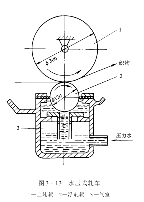 图3-13所示是水压式轧车示意图。其上轧辊为橡胶辊,固定于机架,下轧辊是一只浮在水面上的小直径辊,称为浮压辊,用尼龙材料制成。利用水压系统,将浮压辊均匀地压向上轧辊。这样,小直径的浮压辊就不会产生挠度。但是,由于需要配备一套水压系统,密封件又易磨损,因此,水压式轧车现在较少使用。