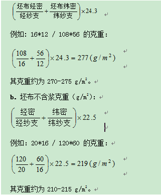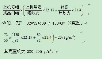 参照以上同类别成品每平方米重量计算公式.如果经纬向是线,由于捻缩的原因,成品每平方米重量偏重,大约增重1%。气流纺纱因为配棉较差,短纤维较多,通过印染退浆、丝完工序纤维损失率较大,所以纱系数用24或24.3*0.95,此系数为经验公式,对于32S以上的纱线支数较为精确。本色棉布每平方米重量计算