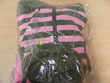 描述:产品由3部分组成:连帽无袖背心,绣有亮片和花案的上衣和长裤,有不同颜色组合成。附有标签,包含产品相关信息,品牌(YHTZ sport)、原产国(中国)和成分(65%棉,35%涤纶)。产品外包装是透明塑料袋。