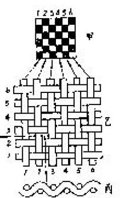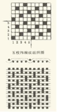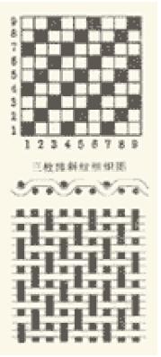 为了便于直观表示织物中经纬浮沉交错情况,可以用三种图形来表示:组织图、结构图、剖面图。组织图可画在小方格纸上,方格纸上纵向代表经线,横向代表纬线。为记忆方便,经组织点在方格纸上以涂黑色或符号的形式来表示,纬组织点则以空白方格表示。图中自左向右的数字表示经纬顺序;自下而上的数字则表示纬线顺序。