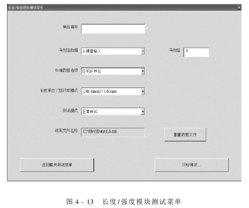 模块测试的目的是为了测试独站的纤维参数。模块测试模式同意操作者获得独站检测的测试数据。在系统测试中显示的是全部操作次数完成后得到的平均值。模块测试可分别完成长度/强度、马克隆值、颜色/杂质的测试。不同模块测试中进行的测试是相互独站的,只有被选中的模块的数据是集中的。模块测试菜单如图4-12所示。
